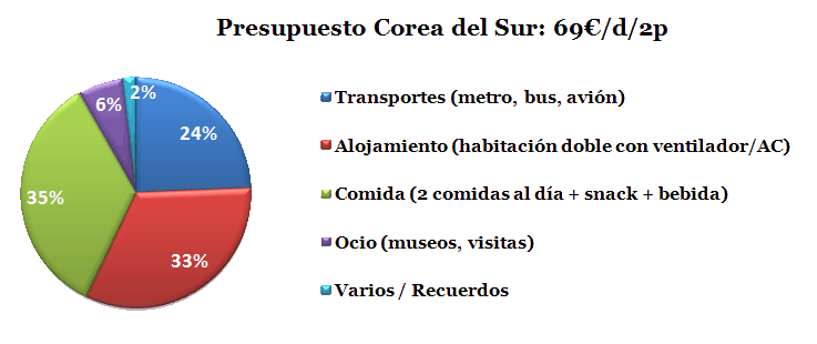 Comida: Lo hemos probado todo: restaurantes, night markets y supermercados. Los precios son abordables teniendo en cuenta que se trata de un país tan desarrollado como España. La gastronomía local se centra principalmente en variantes del kimchi y los hue (sashimi coreano).